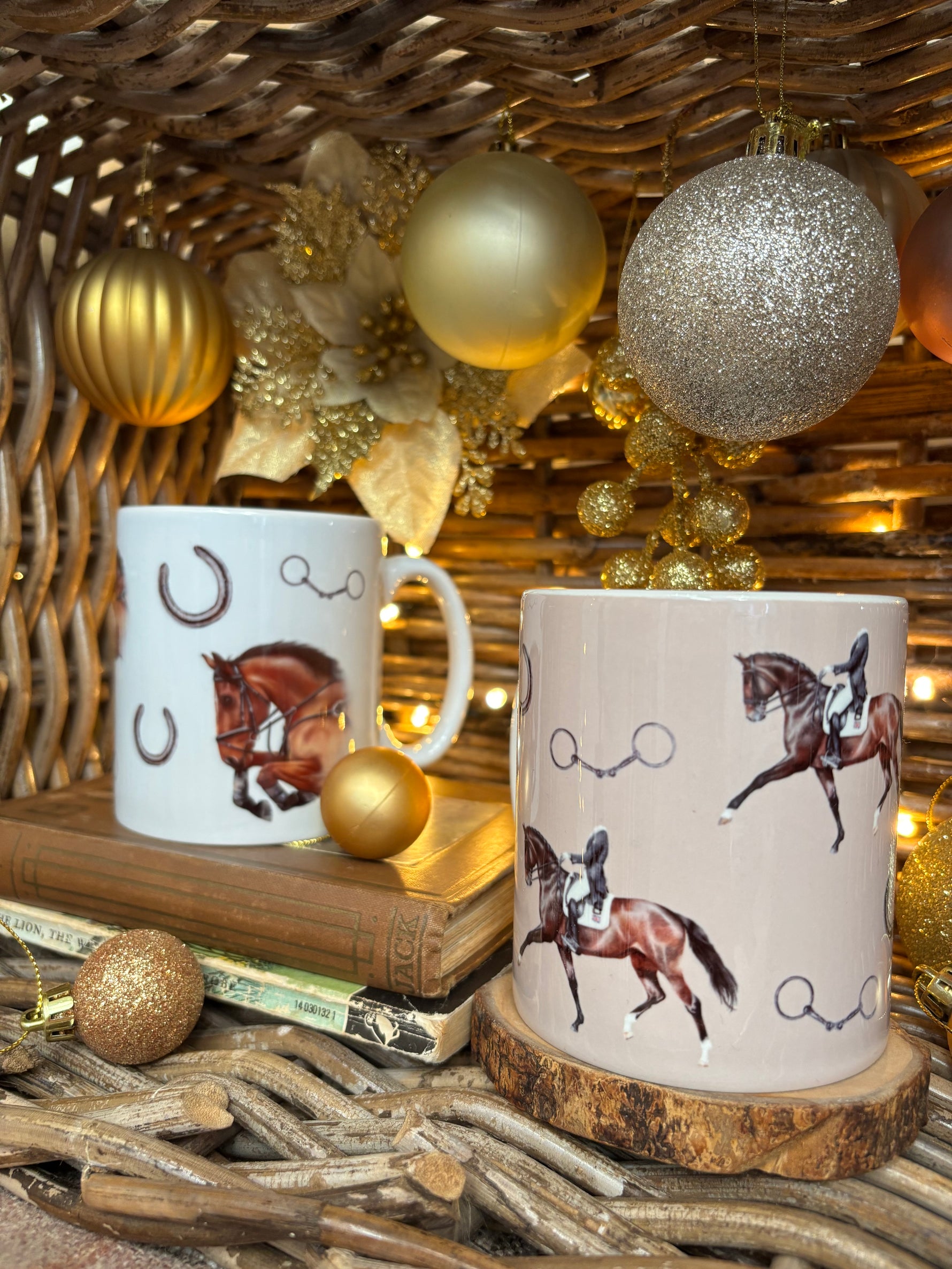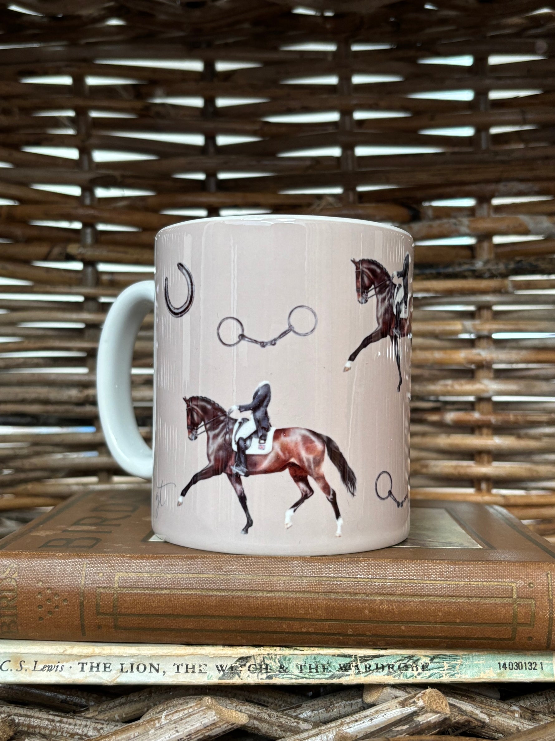 Start your day right as you sip from my dressage horse mug, featuring a patterned dressage inspired design that captures the dressage competition life.
