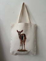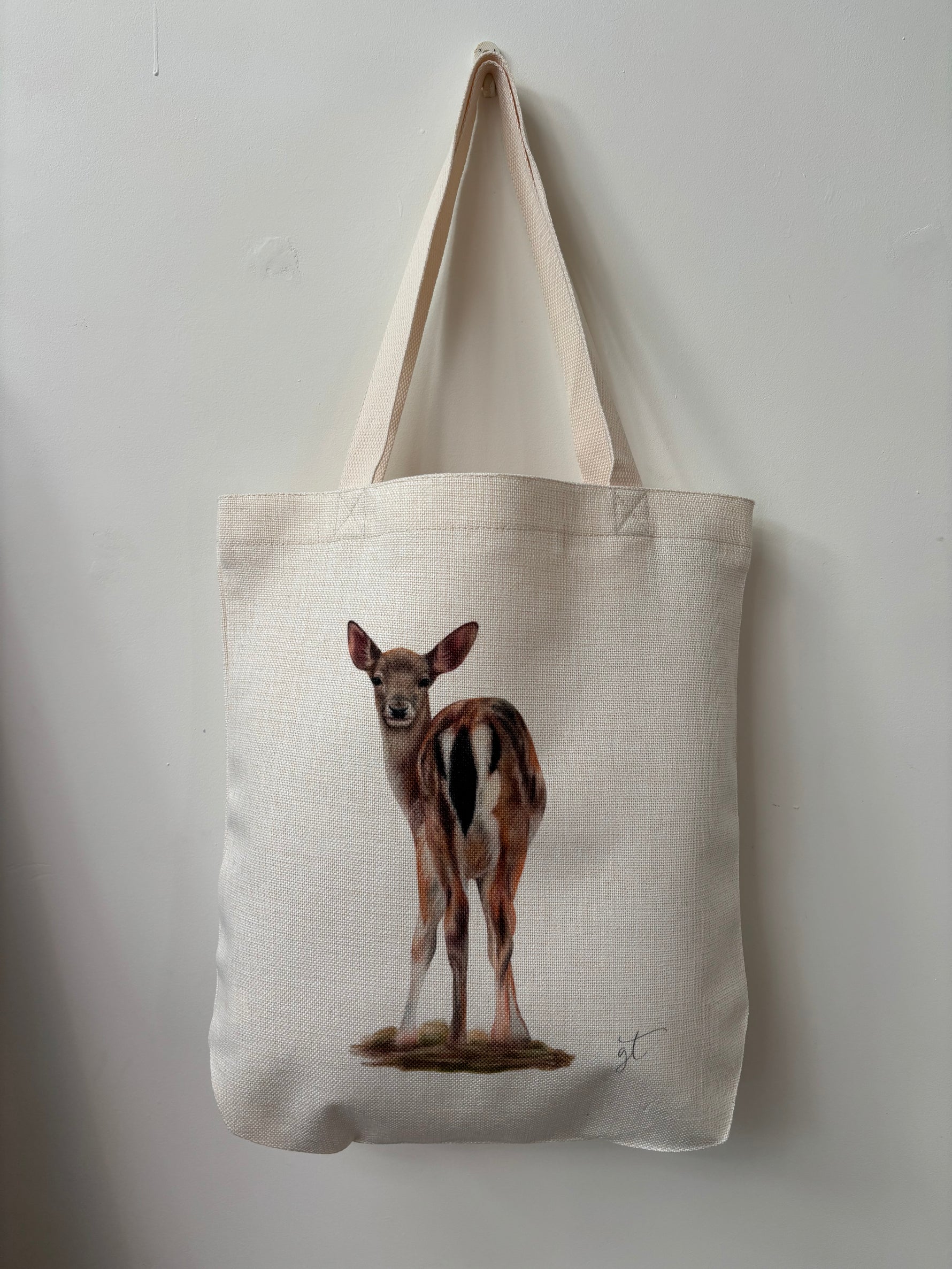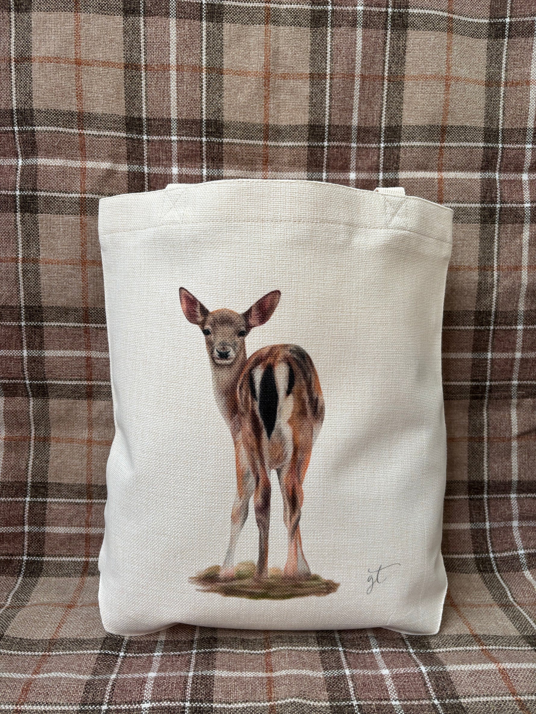 The design of this tote bag was originally created by hand in colour pencil, capturing a beautiful fawn in a forest.