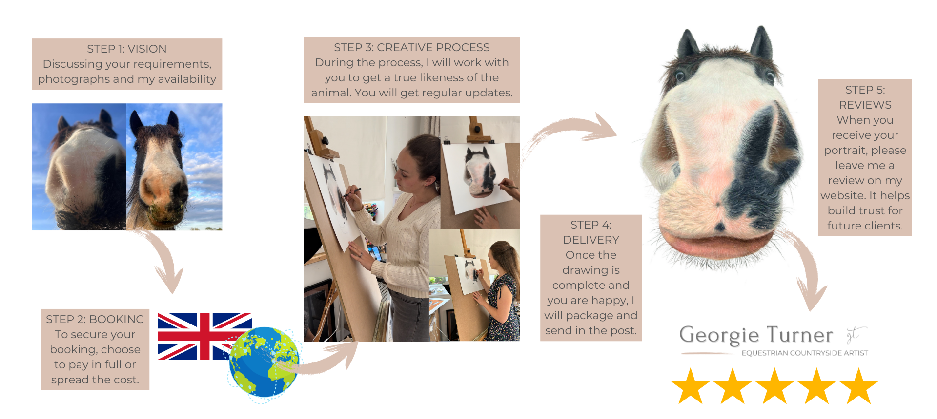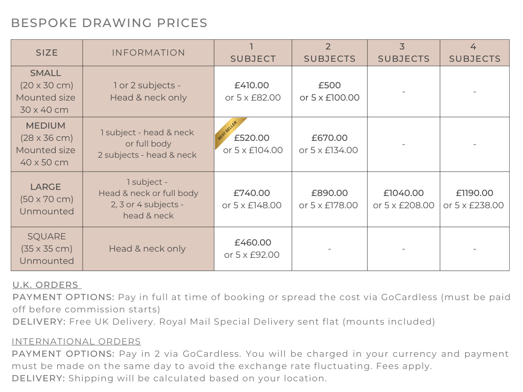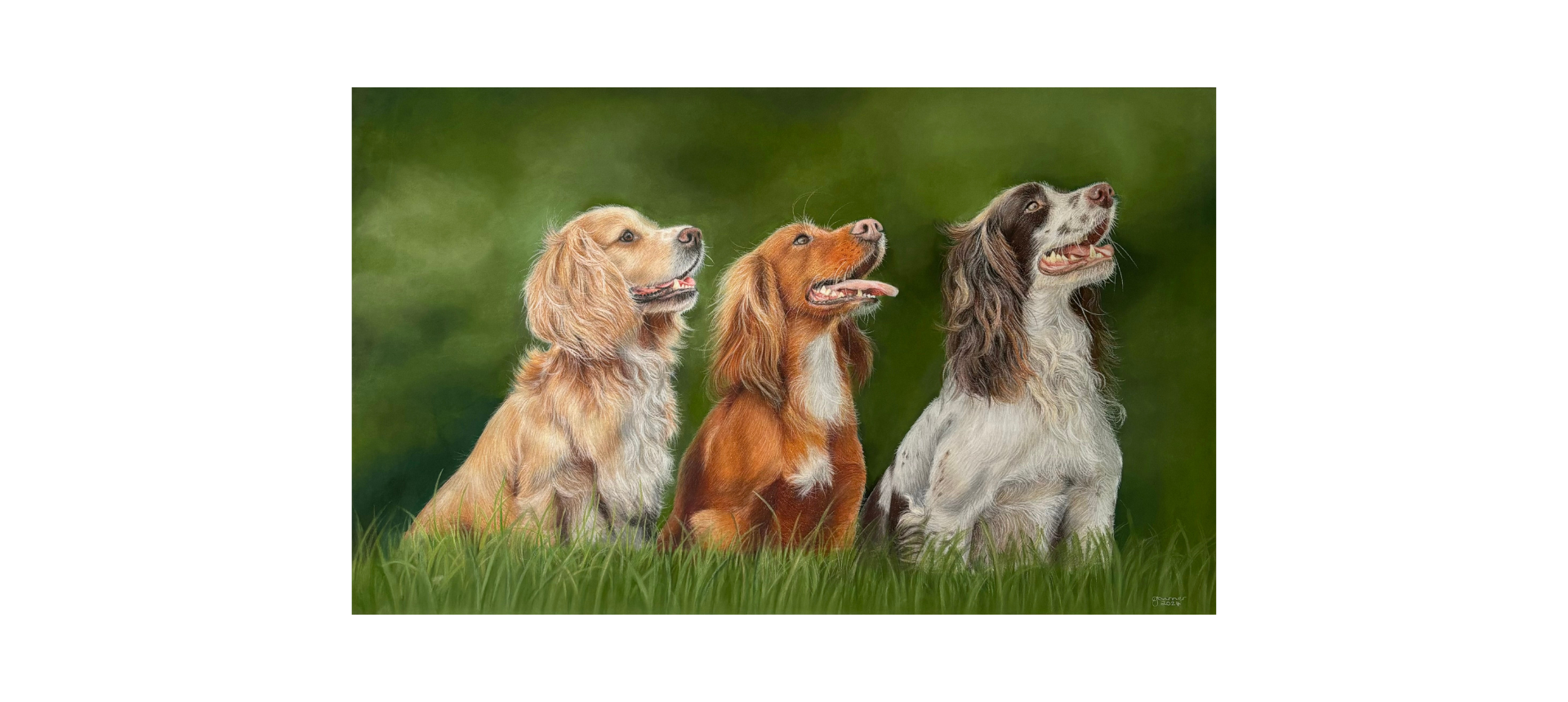 I met Georgie at The Game fair in July 2024 and we discussed a potential commission of my 5 dogs who were with me. I loved her portrait of the 3 spaniels she had on display and was keen to have something similar of my pack! Georgie was great at keeping in touch and I felt really involved in the entire process from start to finish.