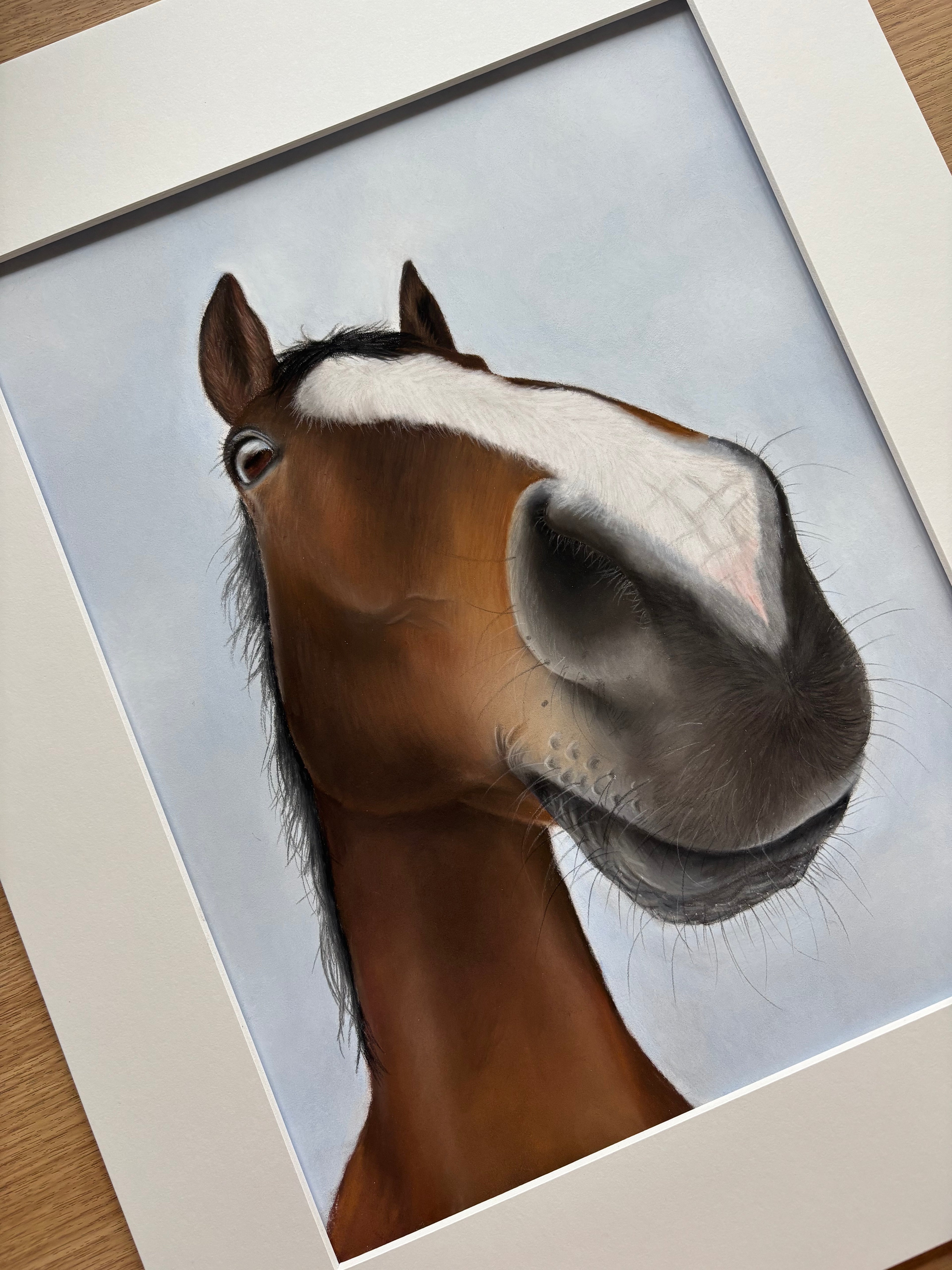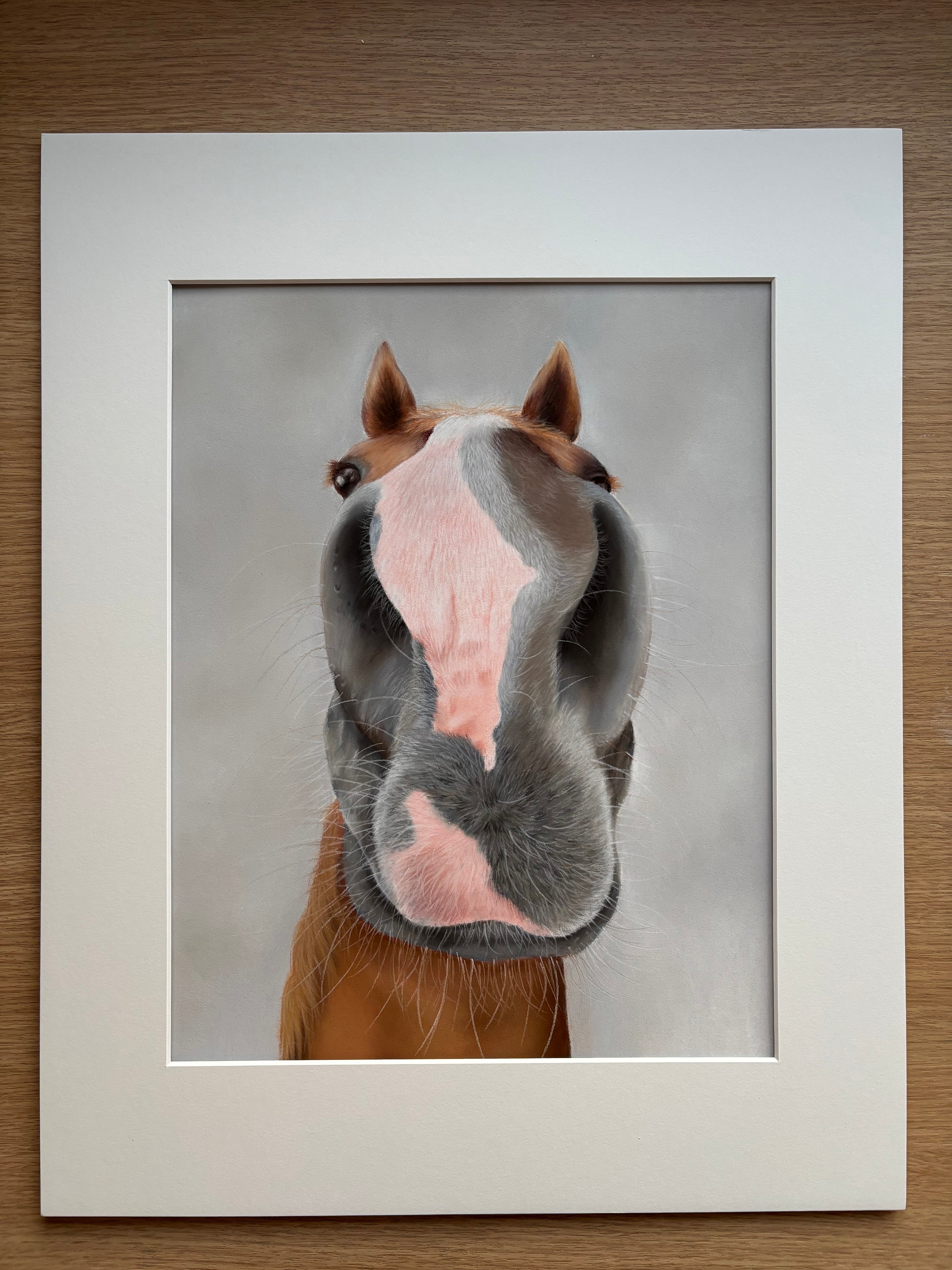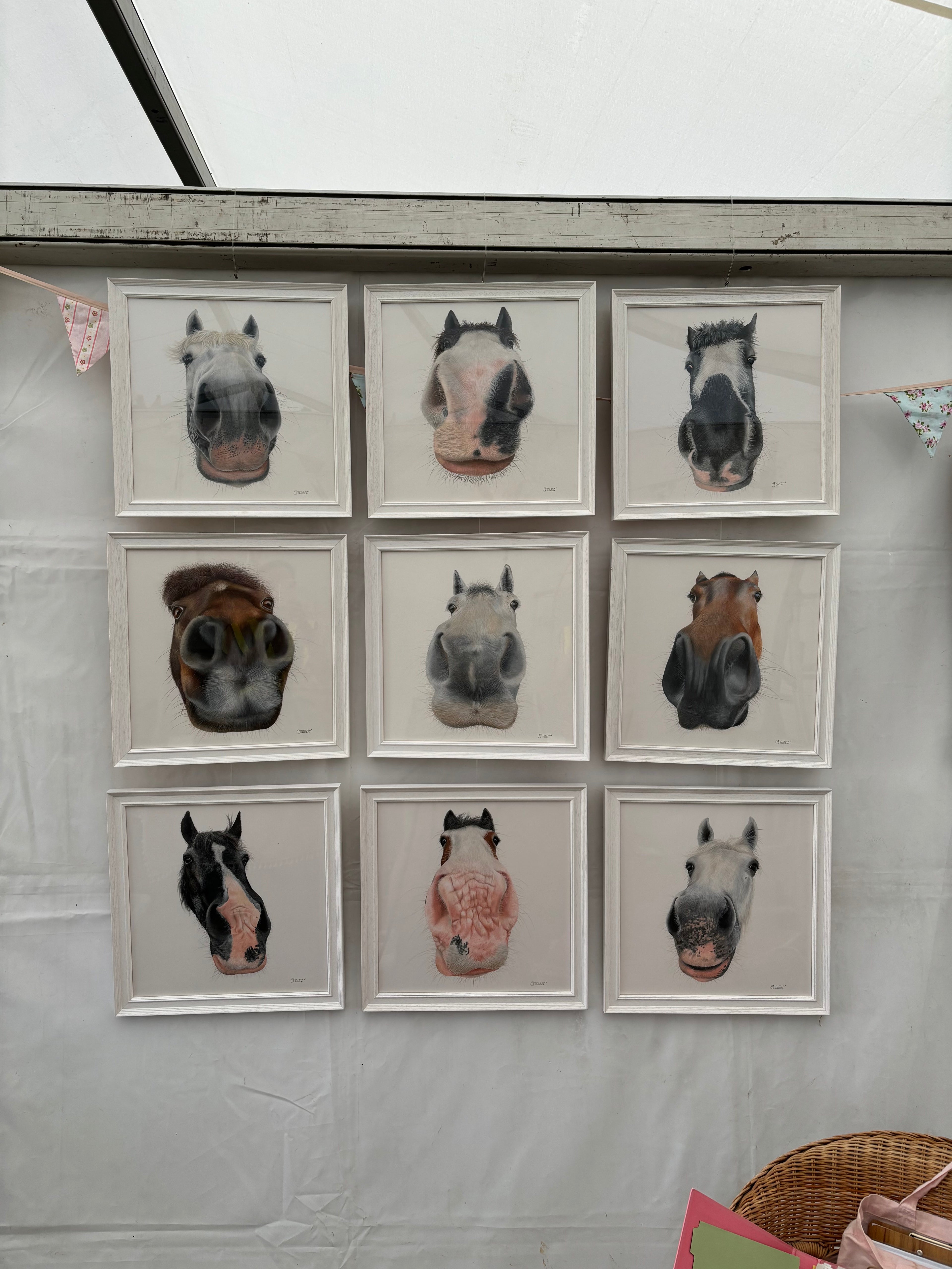 As more and more clients started asking for a portrait in this particular angle, I realised I had something unique and launched the Nosy Pony exhibition in 2024. 9 clients signed up to get a framed nosy pony portrait drawn which I exhibited at The Game Fair in 2024.