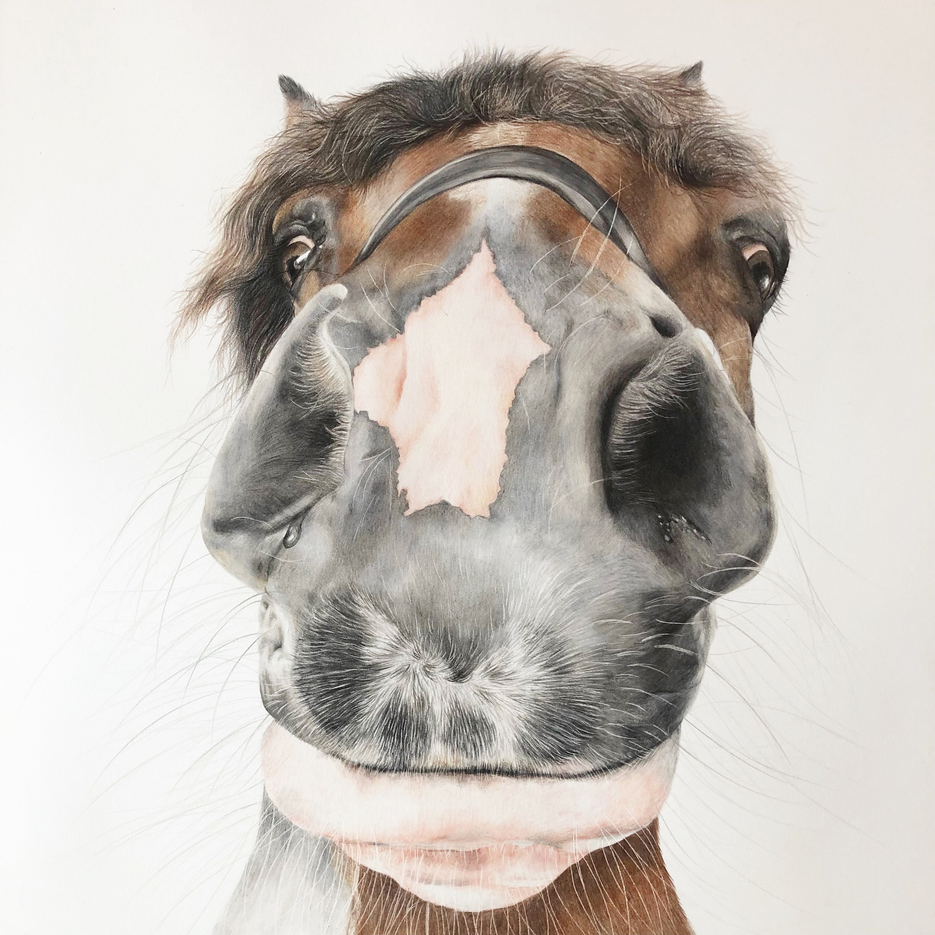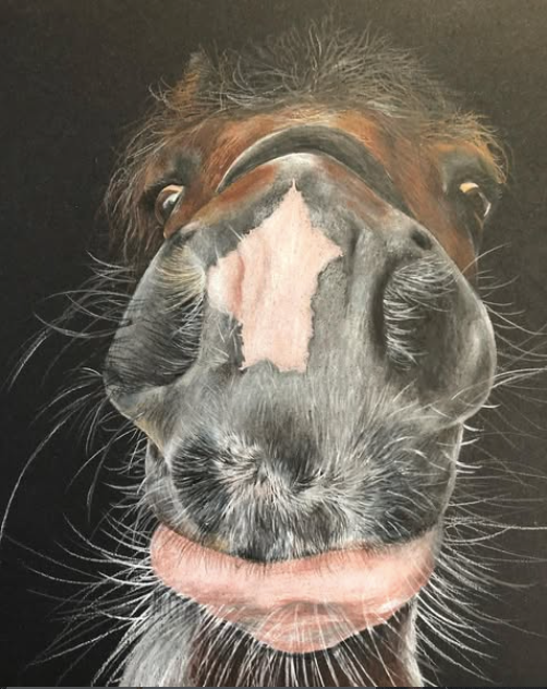 Nosy Pony is a style of art that really came to me by accident. I took a photo of my horse, Polly and did a quick sketch on black paper to see what it was like drawing something a little bit more unusual. The response I got on Instagram gave me the drive to draw the image again but on a larger scale and ever since I put that image out into the World, the nosy pony craze was born!