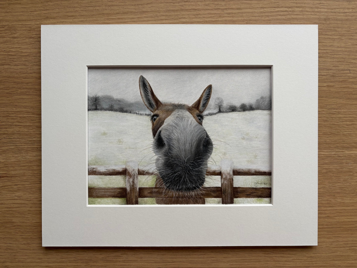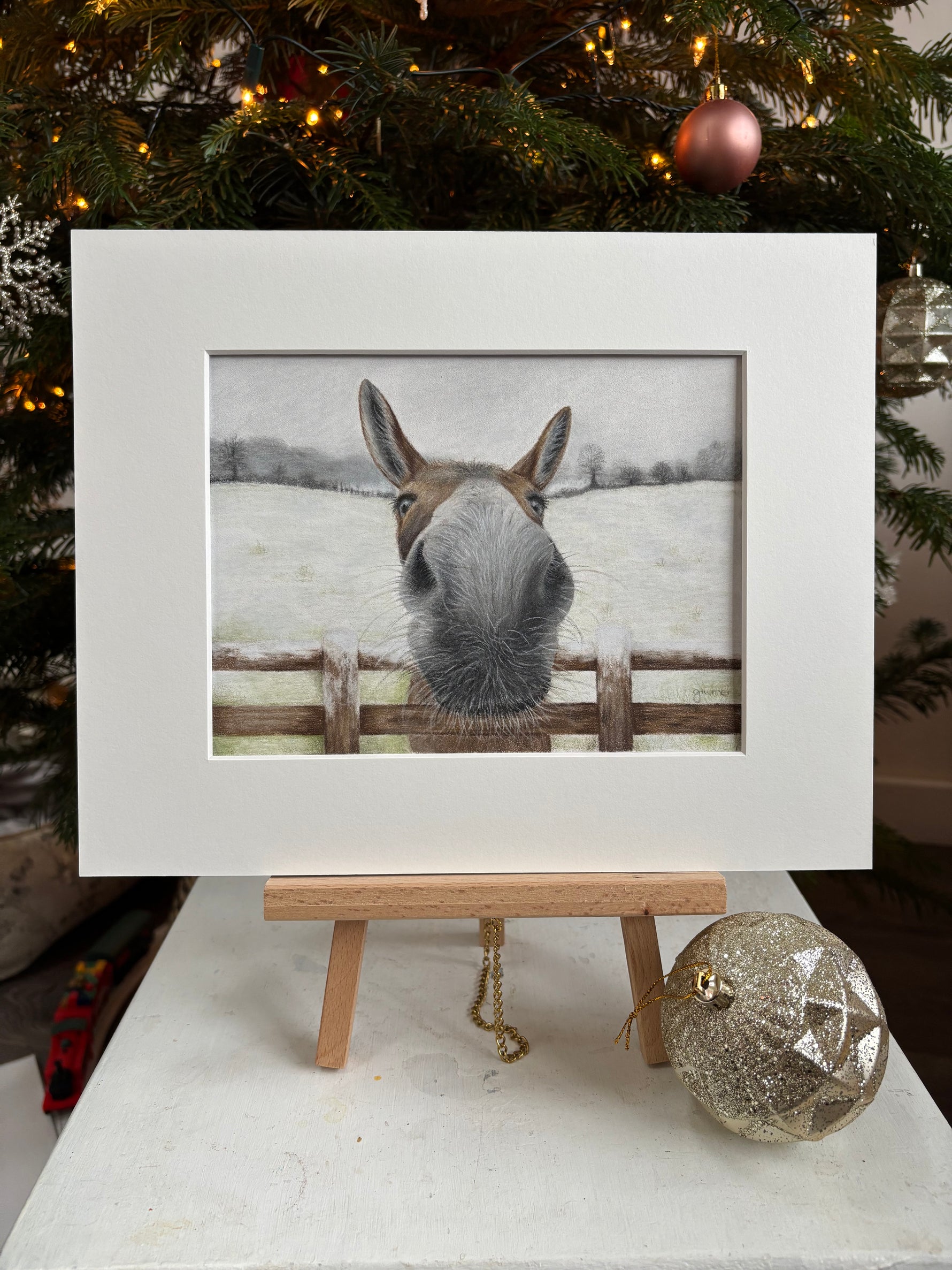The original Nosy Donkey artwork completed in colour pencil. This sweet donkey really needed to be turned into my unique Nosy style and so I created this wintery scene used on my 2025 Christmas cards.