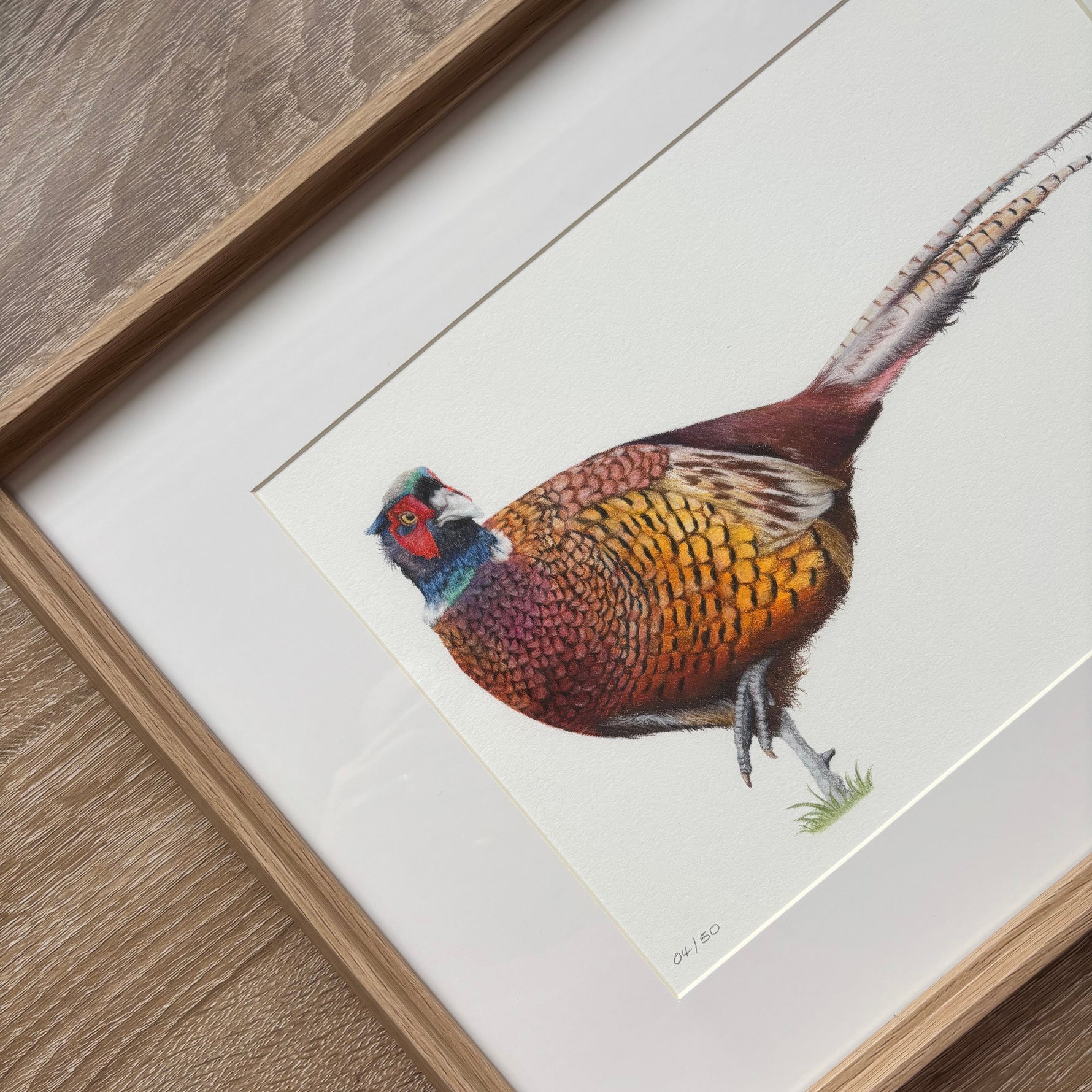 Pheasant Fine Art Print - Country Wall Art | Limited Edition displayed in a light wood frame on a wooden surface, ideal for rustic home decor.
