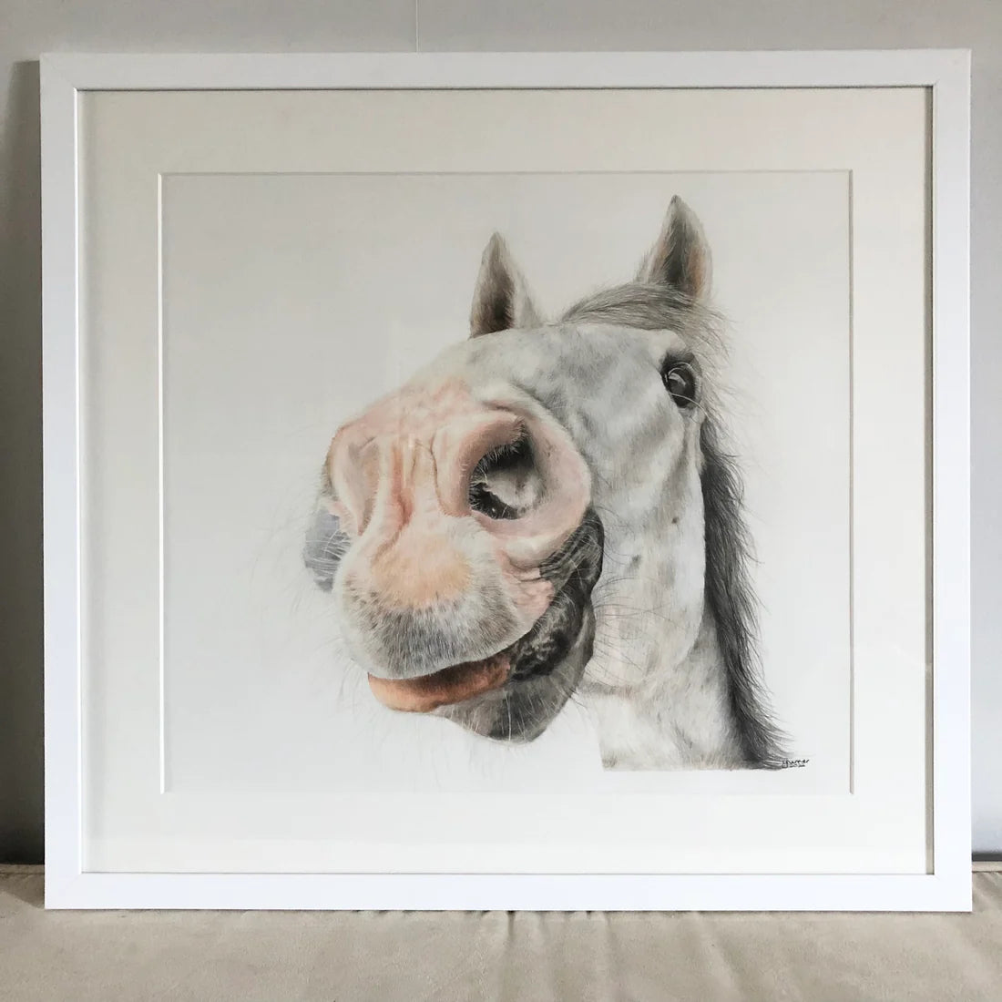 Nosy Pony has been professionally framed in a white frame behind glass and measures 60 x 60cm including the frame.